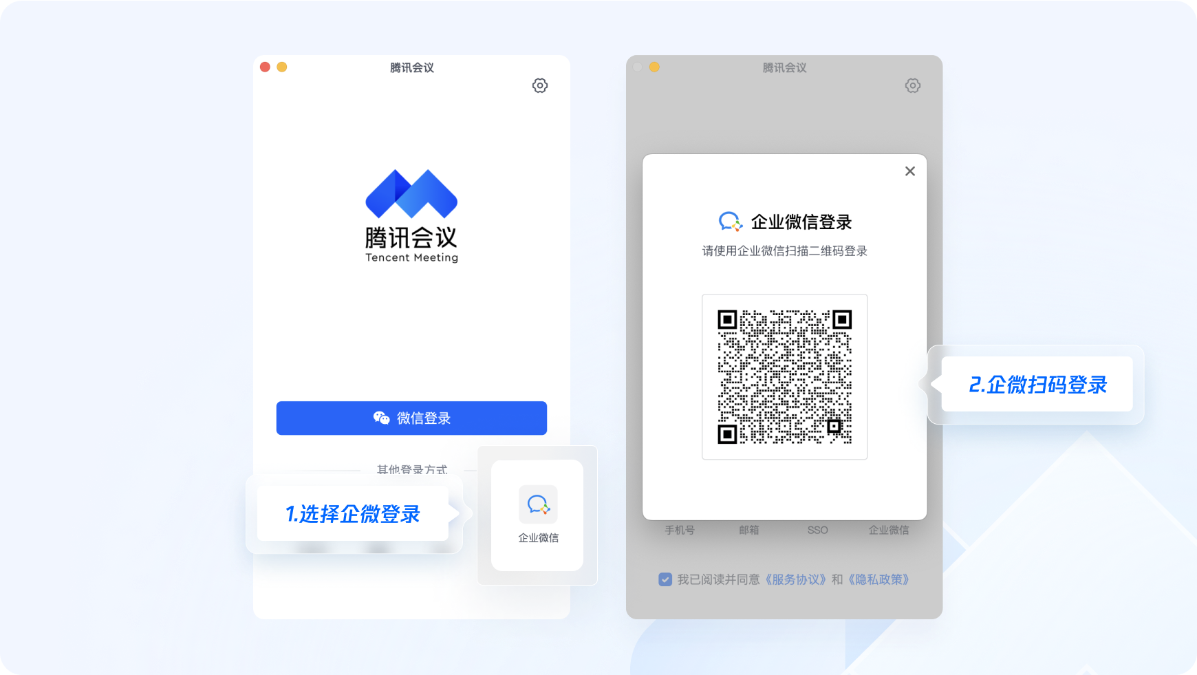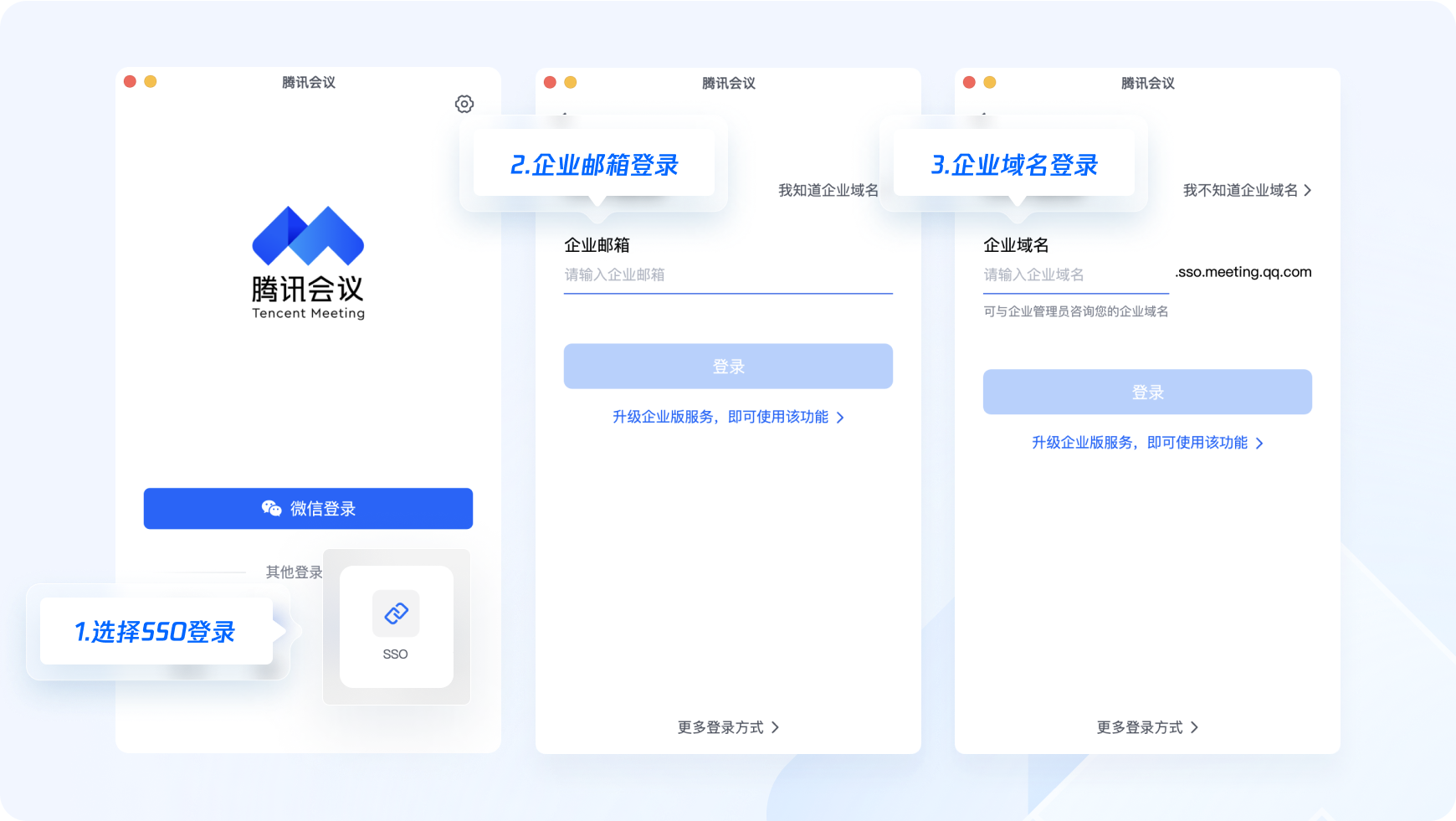 您可将腾讯会议对接到已有的组织/企业账户认证体系中,顺利获得SSO,输入企业域名或企业邮箱,即可登录腾讯会议。