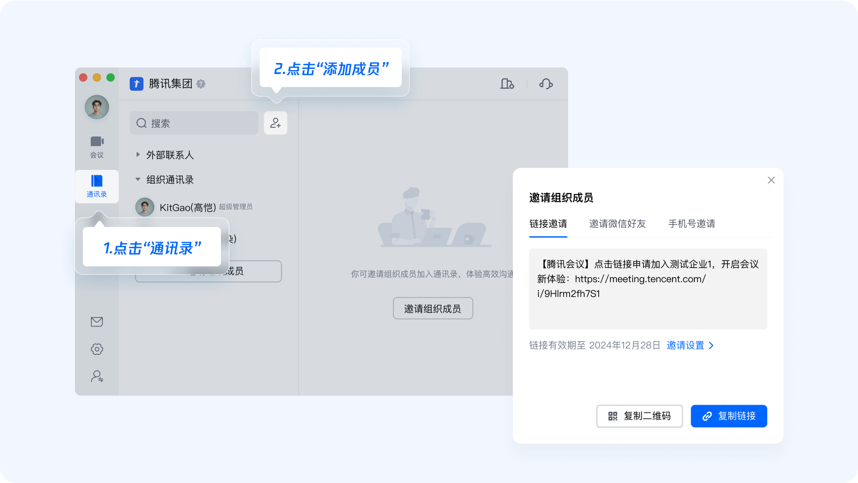 作为企业管理员,您可以在腾讯会议APP、官网顺利获得名单导入、企业通讯录对接等方式邀请成员进入组织,企业管理员将拥有专属的【企业管理后台】,以实现更好的会议资源分配、管理和运维,让组织成员高效协作。