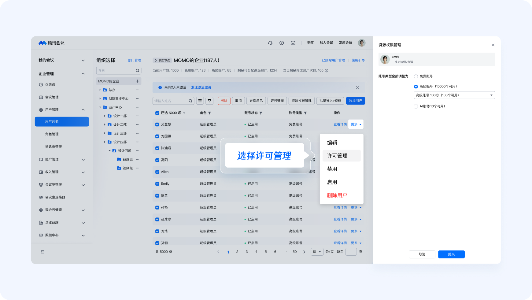 勾选您想要分配资源的所有用户,点击【许可管理】,进行批量处理,实现快速分配。