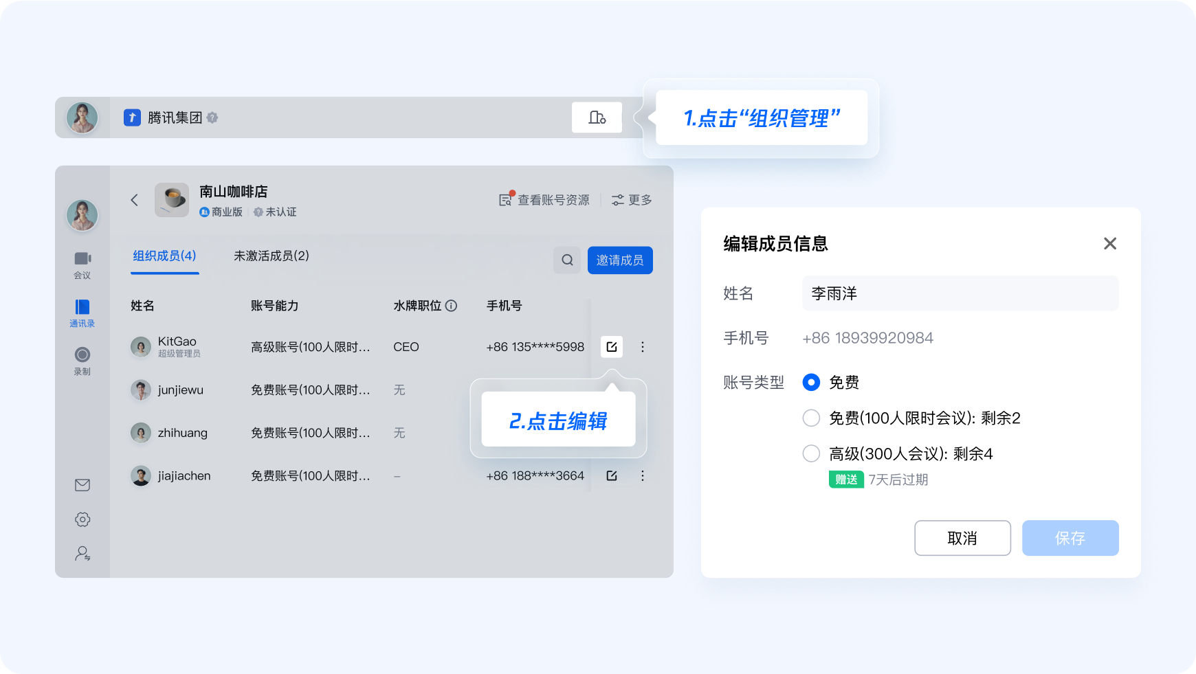 打开腾讯会议APP,点击【通讯录】,在界面右上角点击【组织管理】,即可对组织成员账号类型进行分配。在设置页,您也能查看到【组织管理】操作入口。