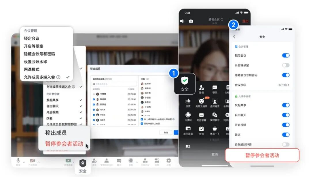 同时,还为您给予包括会议密码、等候室、锁定会议、一键全体静音、共享屏幕等权限管控,让会议主持人和联席主持人一块把控好会议秩序,防止重要内容泄露。如遇紧急情况,还可选择“一键暂停参会者活动”,马上恢复会议秩序。