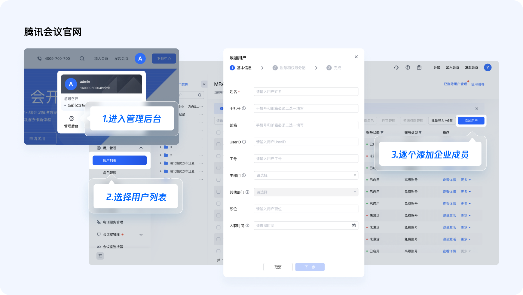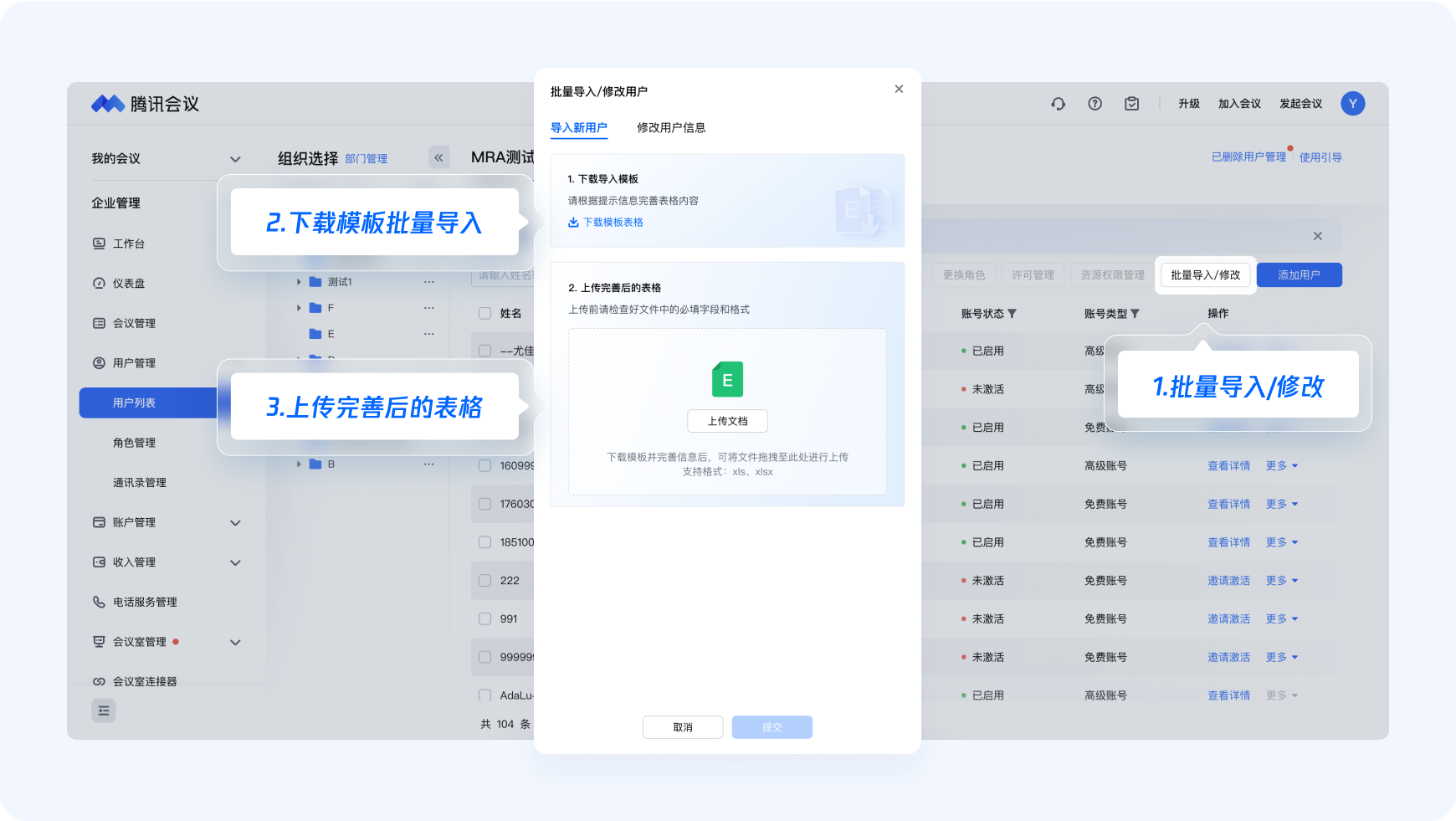 进入腾讯会议官网,点击【个人头像】-【企业管理】-【用户管理】,您可以下载模版进行批量导入,也可以逐个添加企业成员。