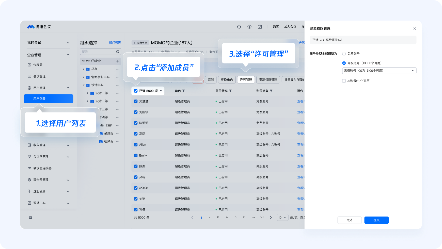 勾选您想要分配资源的所有用户,点击【许可管理】,进行批量处理,实现快速分配。